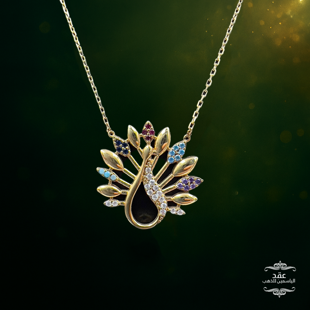 اختاري عقد الطاووس اليوم من متجر عقد الياسمين واستمتعي بقطعة ذهبية أنيقة تنطق بالفن وتمنحك حضورًا لا يُنسى